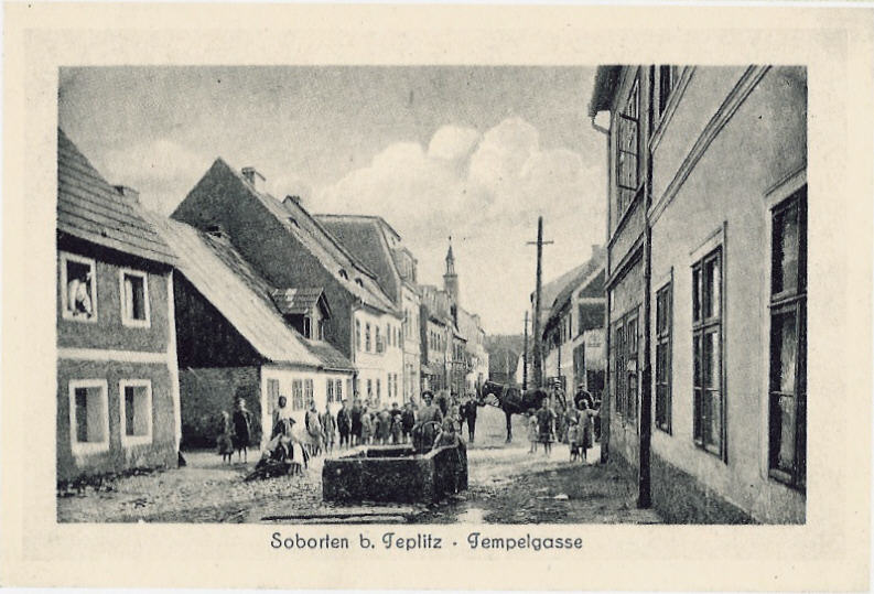 It is a small but expanding tribute and memorial to one of the oldest Jewish Communities in Bohemia, a community that today remains as only a very distant memory. With this website I will try to showcase some of the history of the Jewish Community and its people. Over the years I have collected materials relating to Sobědruhy, I welcome any new information on the Jewish Community and also look forward to hearing from those people who have family or ancestral connections to the town. I have more photographs and information on Sobědruhy and its Jewish community. I would be happy to share this information; feel free to contact me. Also please visit the website of the Teplice Jewish Congregation for information on the small but active Jewish Community that now exists in the city. For purposes of clarity I will refer to the town on these web pages as "Sobědruhy". The official name of this once separate town is now Sobědruhy u Teplice (Teplice-Sobědruhy) as it was annexed to the city many decades ago. Sobědruhy was known as Soborten in German.