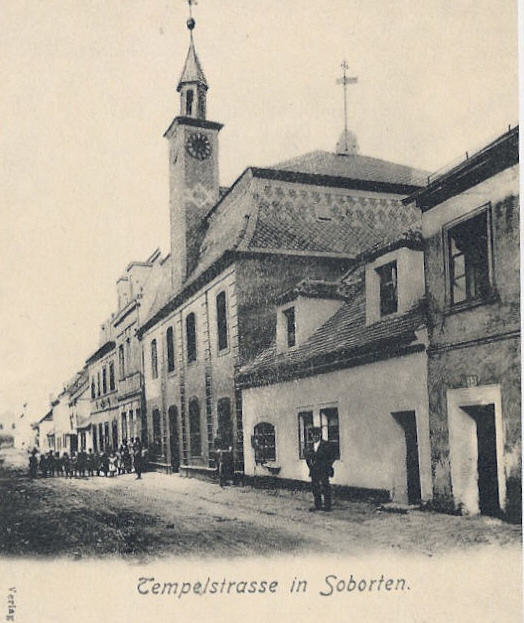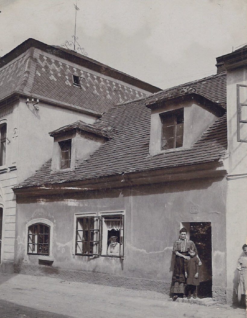 Above Left: Early 20th century postcard of the Judengasse (Tempelstrasse) Above Right: Photograph of the Preissler/Bauch ancestral home at #32 Judengasse in Sobědruhy. ca. 1900. The home was located next door to the right of the synagogue itself.